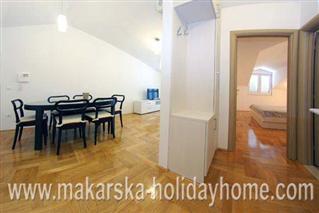 Apartment Židić A2 / 57 m2 / 4. floor / located in the central part of Makarska near the beach and hotel "Meteor", located just 30 meters from the beach and downtown. The apartment consists of two double bedrooms, living room, kitchen, dining room + bathroom + balcony with sea view, garage.